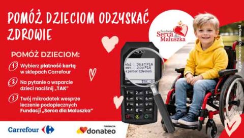 Jeśli w najbliższych tygodniach będziesz robić zakupy w sklepie sieci Carrefour Polska, pamiętaj – możesz pomóc jednym kliknięciem. Wybierz „TAK” przy płatności kartą i wesprzyj dzieci Fundacji Serca dla Maluszka.