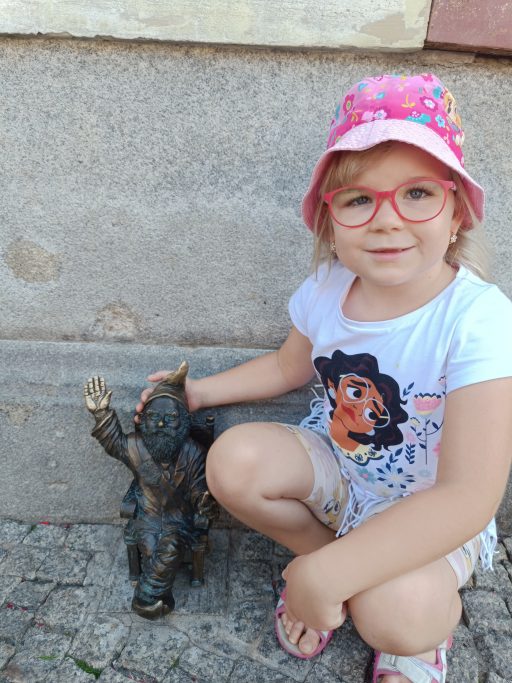 Zrobiliśmy badania w wieku 4 lat. Badania wykazały wadę rozwojową kręgosłupa na pograniczu szyjno-piersiowego. Anielka ma też wadę wzroku - Astygmatyzm i zespół Std: zaburzenie ruchomości oczu.