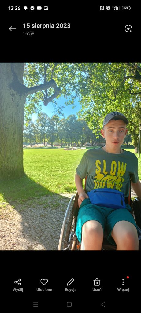 Od urodzenia jest intensywnie rehabilitowany. Obecnie uczy się w Specjalnym Ośrodku Szkolno-Wychowawczym i regularnie korzysta z rehabilitacji oraz wsparcia psychologicznego.