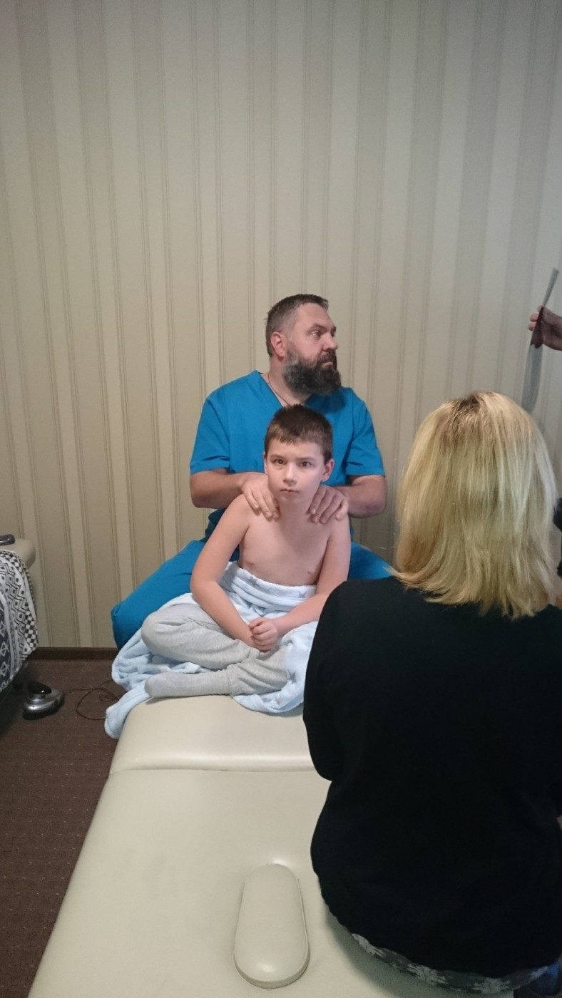 Przełomem okazały się konsultacje z ukraińskim lekarzem w Krakowie w październiku 2015r. Doktor Vitalij Vel – traumatolog zdiagnozował u naszego synka zespół niewydolności tętnicy kręgowo-podstawnej szyjnego odcinka kręgosłupa na skutek przemieszczenia kręgów szyjnych C1, C2 i C3, co prawdopodobnie miało wpływ na uszkodzenie układu piramidowego, wzmożone napięcie szyi i mogło skutkować utrudnieniem w przepływie krwi, ewentualnie płynu mózgowo – rdzeniowego. Taka niewydolność tętnicy w skutek jej zwężenia jak nam wytłumaczył powoduje ograniczenia przepływu krwi, które prowadzi do niedokrwienia mózgu i może powodować takie objawy jak u naszego synka tj. zaburzenia ruchowe i czuciowe, zaburzenia mowy lub jej rozumienia a u innych dzieci np. niedowłady, porażenia czy tez ból i zawroty głowy. Obecnie jesteśmy po 4 turnusach rehabilitacyjnych, które miały na celu korekcji tkanek miękkich kręgosłupa prowadzonych przez zespół lekarzy wertebrologów, fizjoterapeutów i neurologa kierowanych przez dr Vitalija Vel.