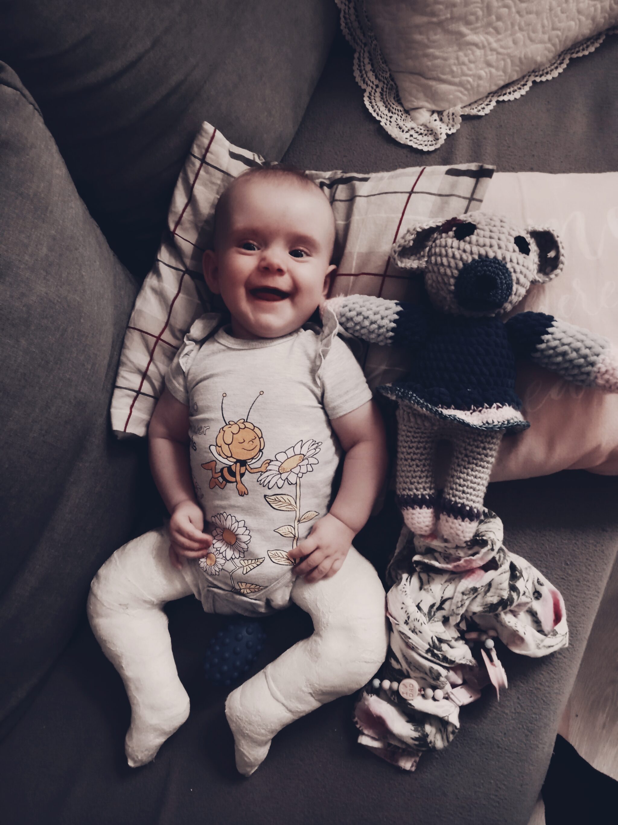 Hania korzysta ze spotkań z fizjoterapeutą, który rehabilituje ją metodą Vojty. Dodatkowo chodzimy na masaż, aby poprawić krążenie oraz ulepszyć kondycję nóżek. Codziennie walczymy również w domu wykonując ćwiczenia oraz masaż Shantala.