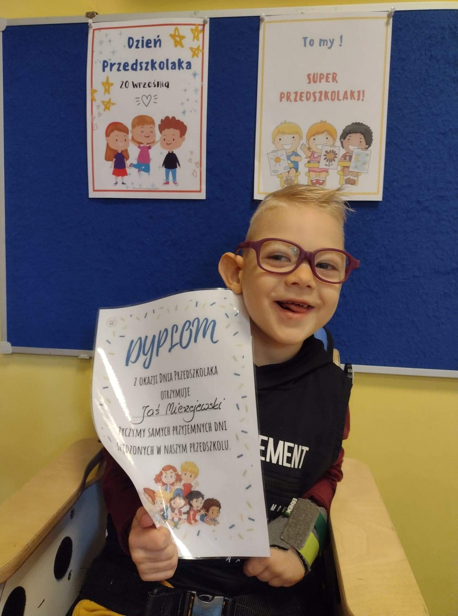 Dziś jestem już przedszkolakiem! Dzielnie uczestniczę w rozmaitych zajęciach fizjoterapeutycznych, logopedycznych, sensorycznych. Staram się samodzielnie stawiać kroki, ćwiczę w pionizatorze i usprawniam moją lewą rączkę. Uczę się także posługiwać komunikacją wspomagającą w postaci symboli PCS, by każdy mógł zrozumieć, co chcę powiedzieć i przekazać. Wiem, że przede mną jeszcze wiele ciężkiej pracy, terapii, kontroli lekarskich i badań, m.in. w poradni genetycznej i neurologicznej. Chciałbym móc skorzystać ze specjalistycznych sprzętów i jak najczęstszej rehabilitacji.