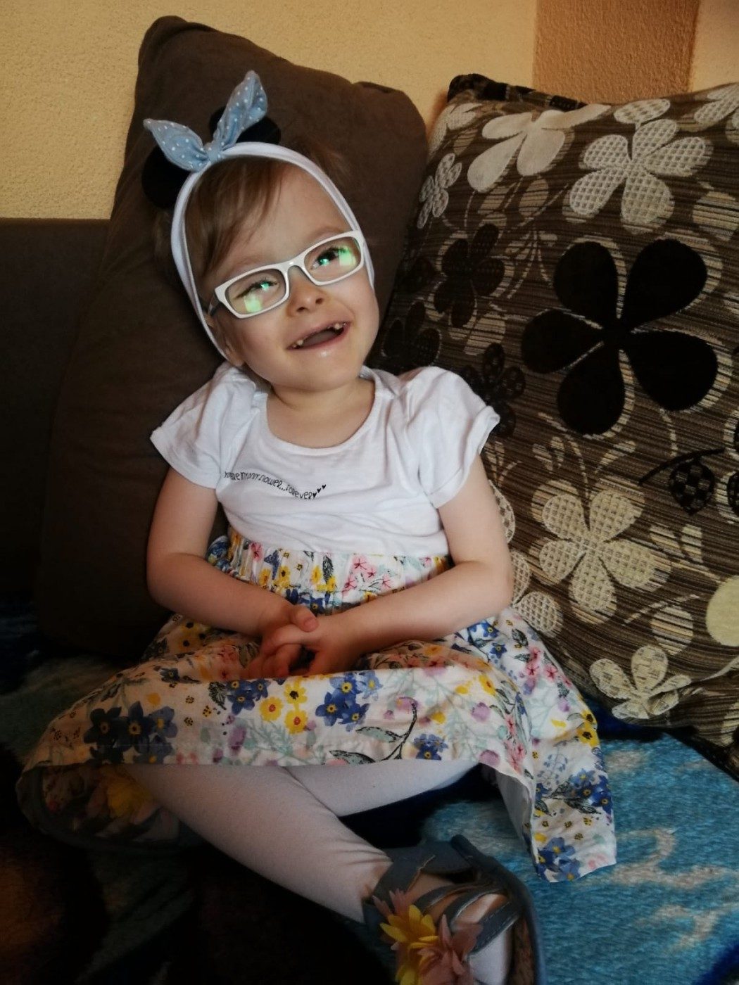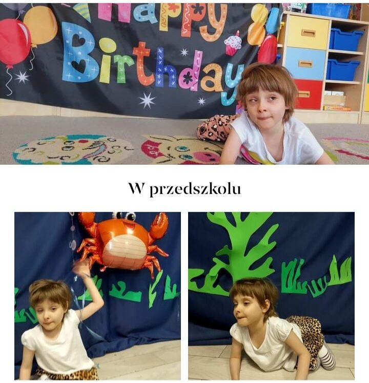 Dziś jestem fajnym urwisem. Mam już 6 lat. Potrafię siadać podpierając się jedną ręką, a drugą sięgam po zabawki. Po swojemu się przemieszczam ( pełzam, przesuwam się na siedząco) byle do celu. Ostatnio udało mi się podciągnąć rączkami w łóżeczku na tyle, że stanęłam sama na palcach, co wywołało ogromną radość całej rodziny.