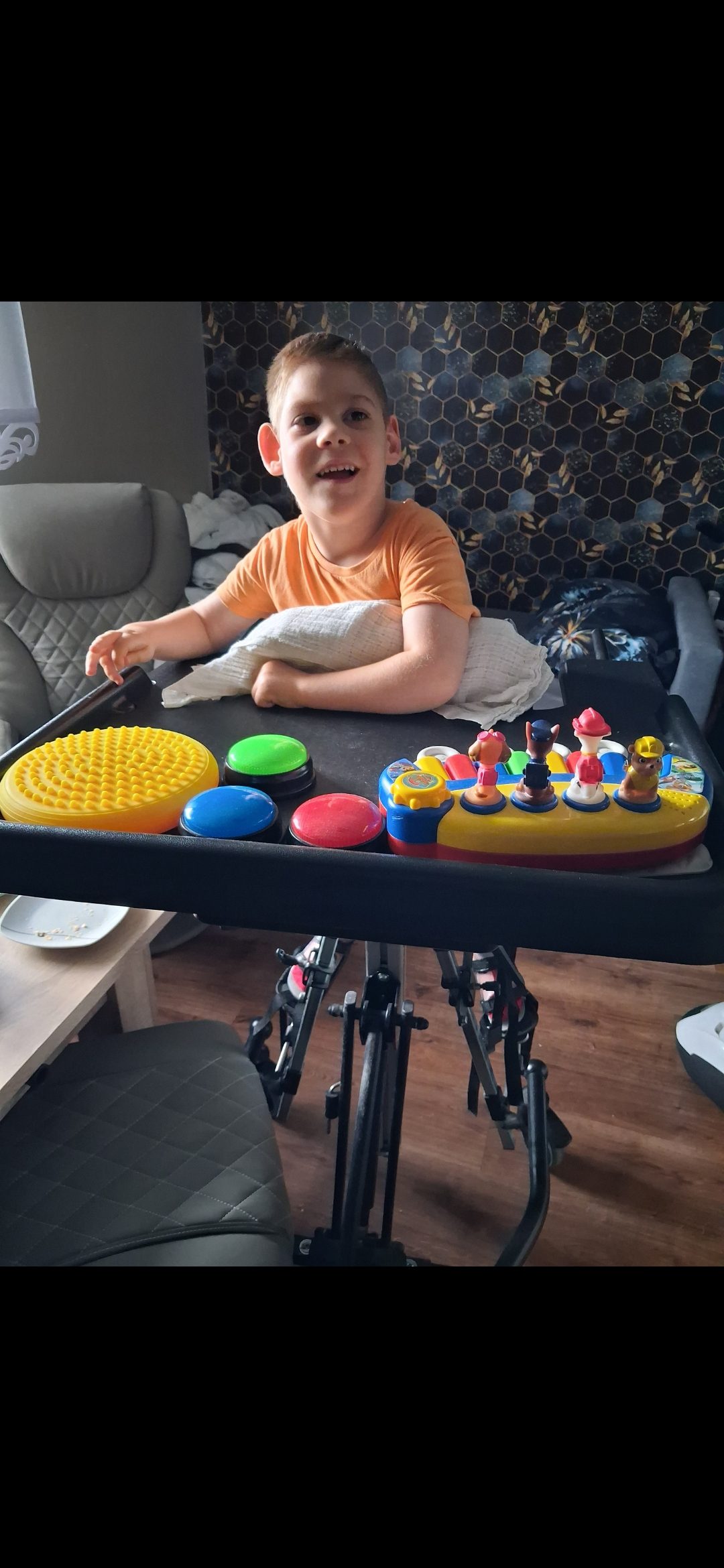 Marcin nie chodzi, nie siedzi, nie raczkuje, nie mówi, nie gaworzy, nie przewraca się na boki, nie trzyma głowy, nie sygnalizuje potrzeb. Jest radosny, uśmiechnięty i chętnie reaguje na dźwięki. Wymaga regularnej, intensywnej rehabilitacji i terapii, przyjmowania leków, zabiegów obstrzykiwania botuliną, sprzętu, by walczyć o sprawność.