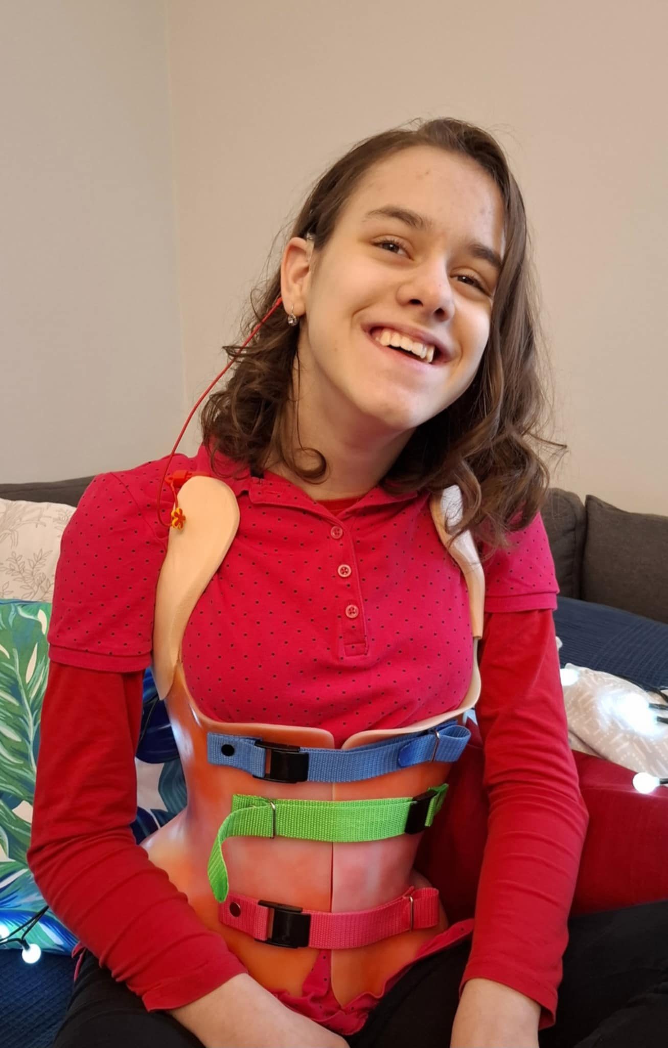 Ze względu na postępującą skoliozę kręgosłupa — Nadia rozpoczęła tzw. gorsetowanie.